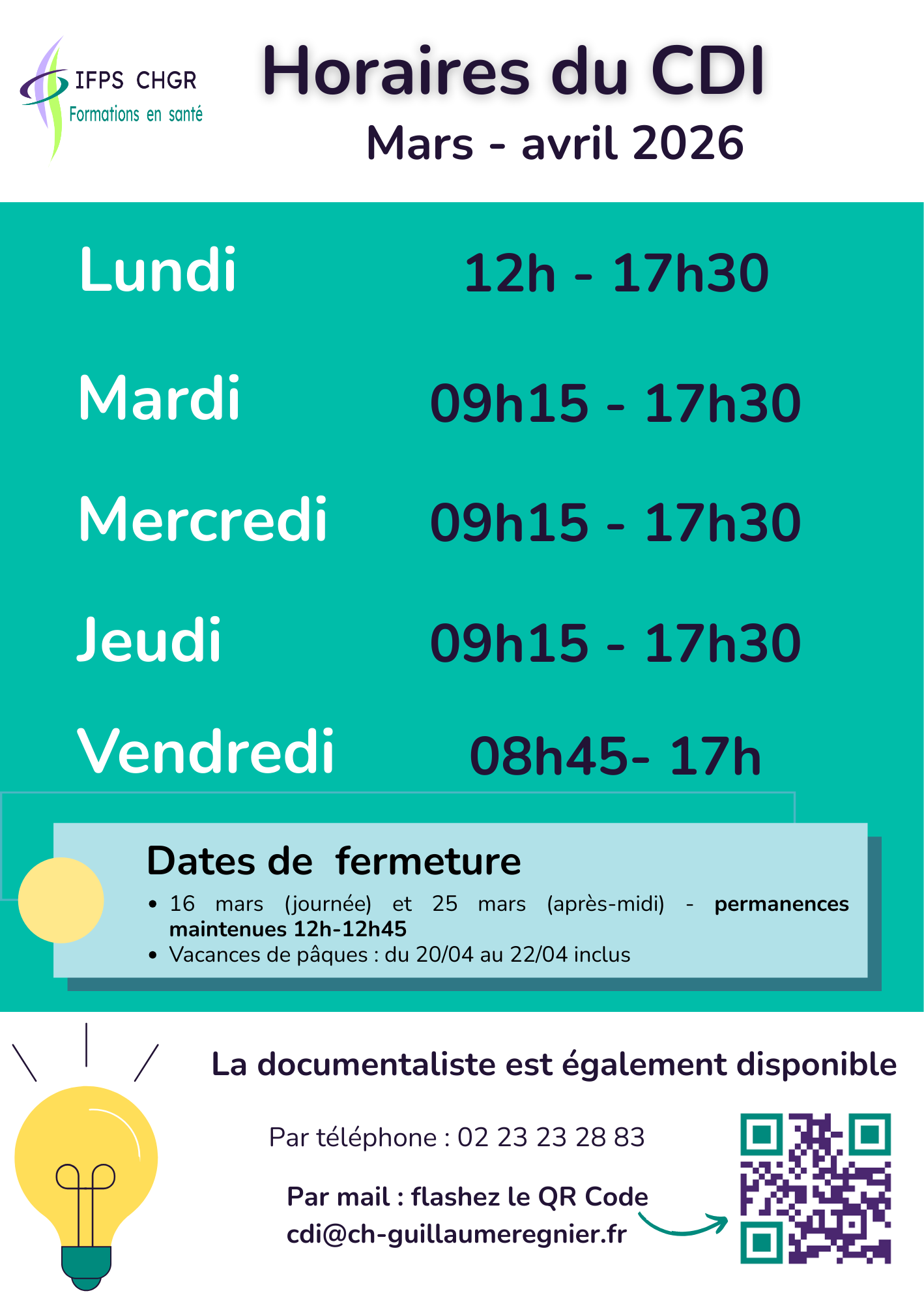 – Vacances de Pâques : fermeture du lundi 20/04 au mercredi 22/04 inclus